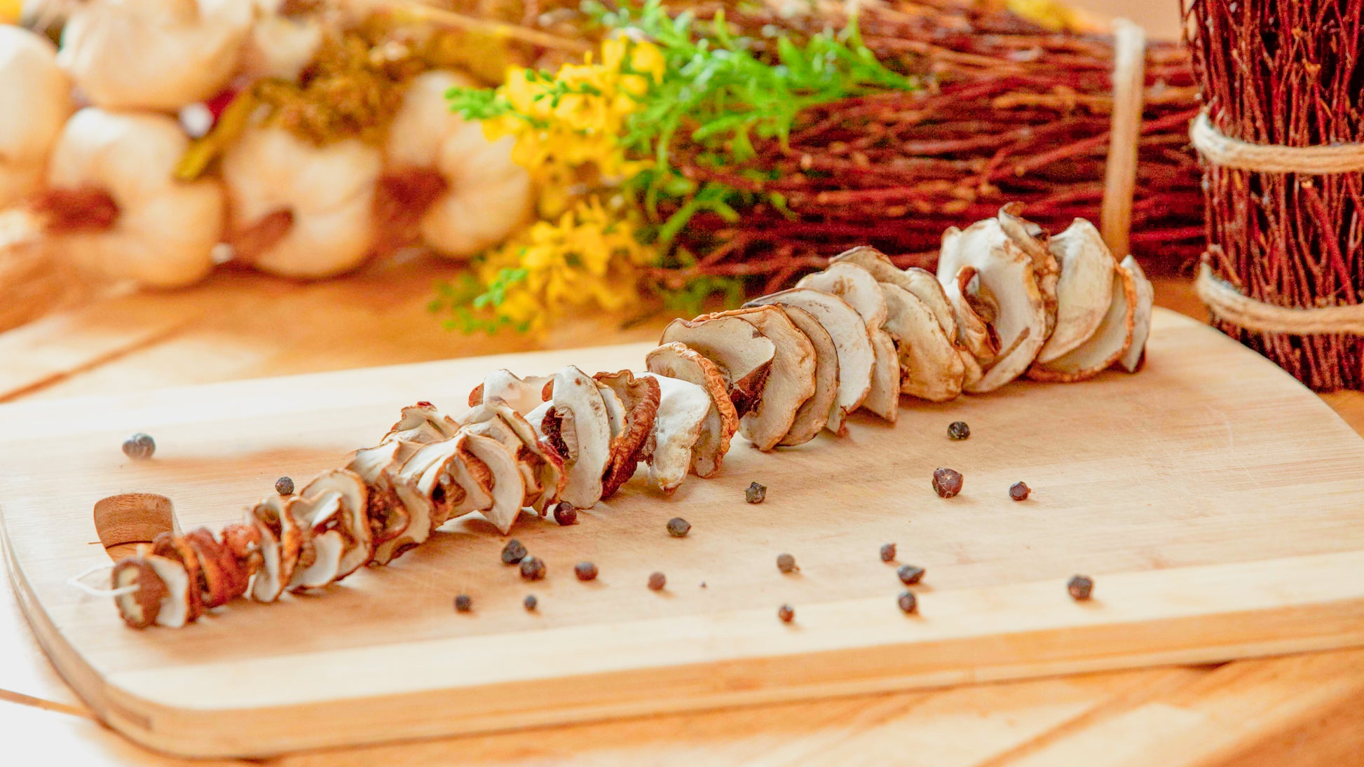 A rare find! These exclusive caps of prized white King Bolete (Boletus Edulis), also known as Porcini or Cepe, are hand-picked from the forests of Poland, dried, and strung by size according to the artisanal tradition. The best gourmet European mushrooms available, they are essential for imparting a luxurious flavor to traditional soups, sauces, and dishes! Net 100g.